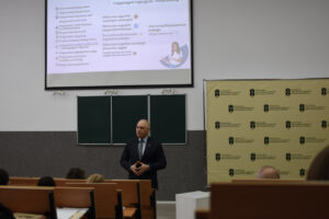 Про можливості соціальної підтримки, професійного розвитку та забезпечення потреб працівників розповів голова Первинної профспілкової організації працівників університету Василь Климончук. У своєму виступі він акцентував увагу на важливості соціального діалогу, партнерства та турботи про університетську спільноту.